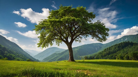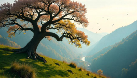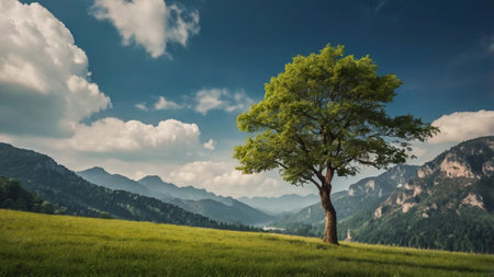 Majestic Tree Overlooking Scenic Mountain Landscape under Beautiful Sky