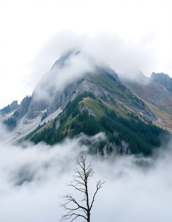 snowy mountain forest in the mist on a cloudy mountain range. captured with the sony fe 85mm f/1.4 gm lens, the image showcases the dark green and emerald hues of the landscape. the zeiss batis 18mm f/2.8 lens adds depth to the serene pastoral scenes. with high dynamic range and a focus on environmental portraiture, this photo is a stunning representation of nature's beauty. ai