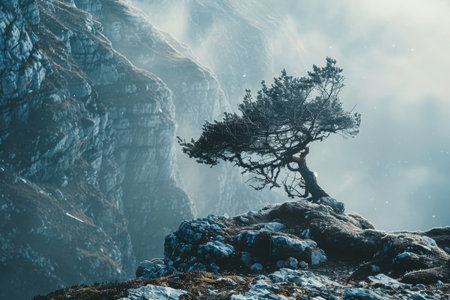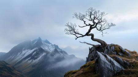 A stunning view of a lone tree perched on a rocky outcrop, surrounded by misty mountains, creating a serene atmosphere perfect for nature lovers.