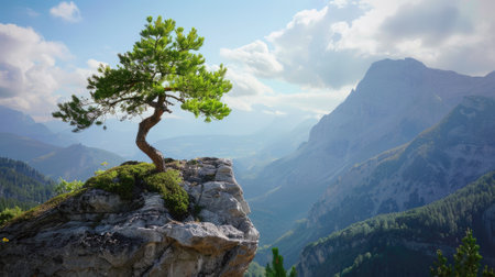 A stunning view of a lone pine tree standing resilient on a rocky cliff, surrounded by majestic mountains and fluffy clouds on a clear day.