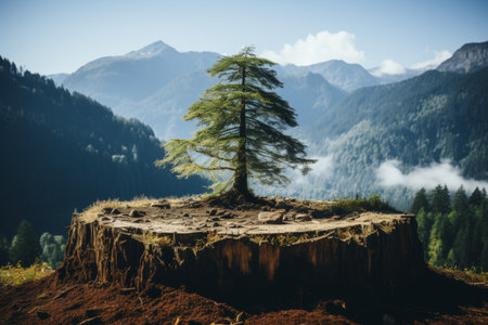 Lonely tree on cliff top at on blue sky background, scenic view of mountains in summer, amazing landscape with rock and green plants. Concept of nature, minimalism, pine, outdoor, scene. Generative AI