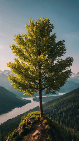 A lone coniferous tree stands majestically atop a rocky outcrop surrounded by lush mountains in the early morning light