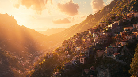 a small town or village is located at the foot of high mountains, all in the sun, warm weather