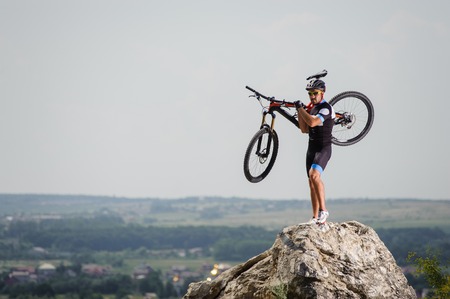 Cyclist on a cliff with the mountain bike talking on the phone to the forest in the background