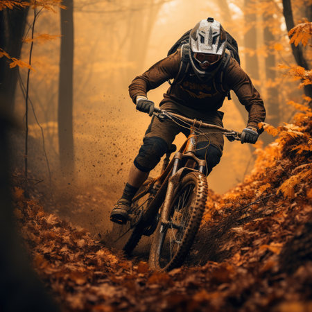 Mountain biker in action, speeding down a misty forest trail with focus and determination