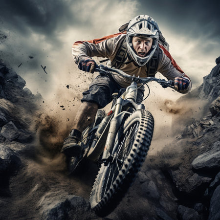 A skilled mountain biker, clad in protective gear, speeds along a winding dirt trail surrounded by vibrant greenery. The image captures the thrill of adventure and the beauty of nature, showcasing the riders determination and the exhilarating rush of outdoor sports.