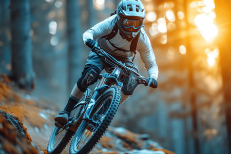 Enthusiastic cyclist navigating rugged terrain and lush forest on a thrilling mountain bike adventure capturing the spirit of and athletic accomplishment