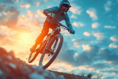 a mountain biker, wearing a helmet and sunglasses, is riding in the sunset.