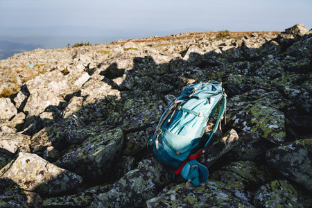 A hiking backpack lies on the rocks, a mountain trip, a single trekking, a bowl with things for a hike, a blue backpack. high quality photo