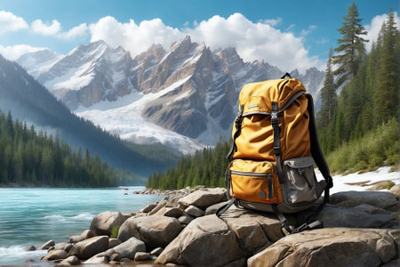 A serene and picturesque landscape of a mountainous region, with a backpack in the foreground suggesting a hiking or camping scenario