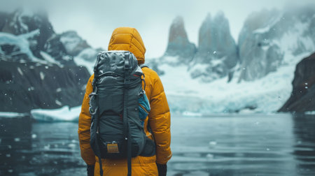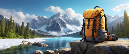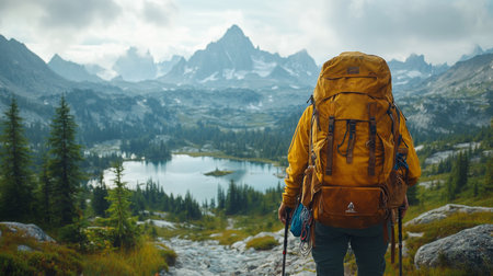 A hiker with a large yellow backpack admires the stunning mountain landscape near a serene lake on a clear day. Generative AI