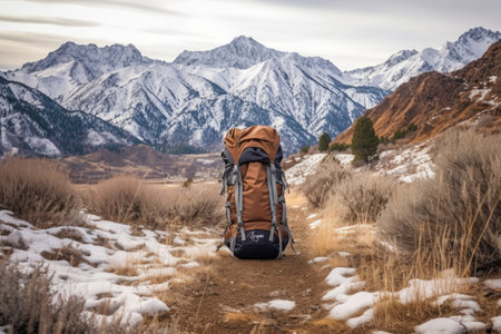 hiking backpack on a trail with snowy mountains behind, created with generative ai