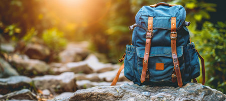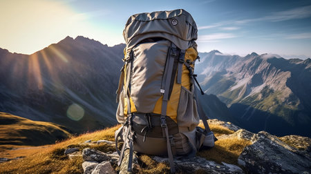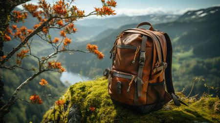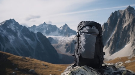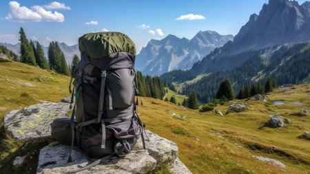 A hiking backpack on a sturdy rock with beautiful mountains landscape. Hiking in a wild nature concept. AI generated