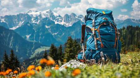 A blue trekking backpack resting on the ground amid the backdrop of the sunlit Alps mountains, evoking a sense of serenity and adventure