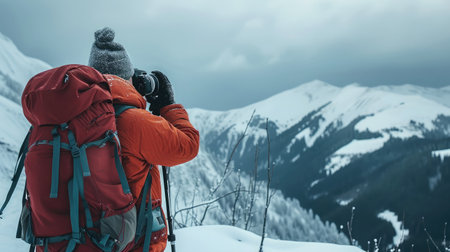 Backpacker standing high, enjoying extreme mountain peak generated by artificial intelligence