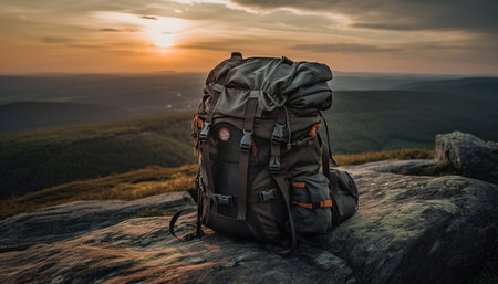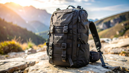 A rugged backpack placed on a mountain peak with a scenic view of distant valleys and rocky ridges, representing adventure.
