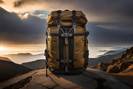 Scenic view of a loaded backpack resting on a mountain ledge overlooking distant peaks under golden sunlight
