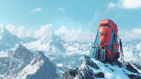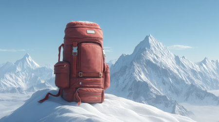 A vibrant red hiking backpack rests on a snow-covered mountain peak, surrounded by majestic snow-capped mountains under a clear blue sky, inviting outdoor adventures.