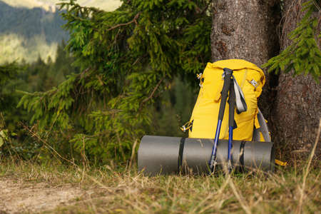 Backpack, trekking poles and sleeping mat outdoors, space for text. Tourism equipment