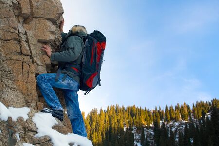 happy traveler carries a backpack in his hands. Bright hiking backpack with equipment,Snowy forest and rocks. Climbing the mountain in winter. Survival in the wild. high quality photo