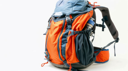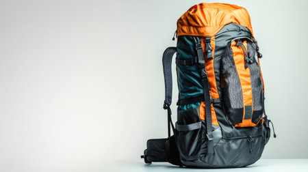 An orange backpack with black and gray accents stands out against a simple white background, symbolizing travel and adventure.