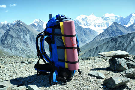 Hiking backpack on a rock in the mountains. The concept of travel and tourism.