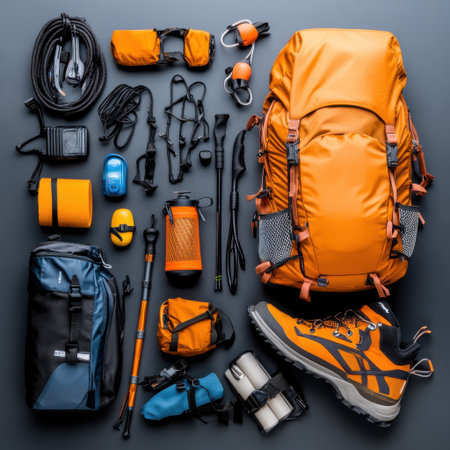 A flat lay of organized camping and hiking gear, including backpacks, boots, and tools, ideal for an adventurous mountain expedition. Perfect for outdoor enthusiasts and travel planners.