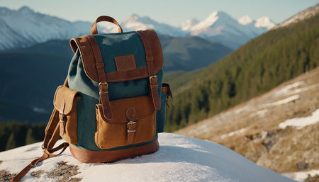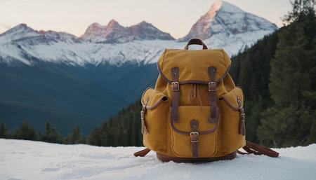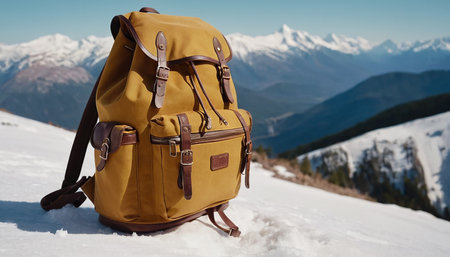 A serene mountain scene featuring a rugged backpack and thermos resting on a snow-covered trail. Majestic peaks rise in the background, offering a perfect outdoor adventure.