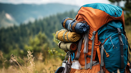 Tourist backpack isolate, mountain peaks background, outdoor activities. Header banner mockup with copy space. AI generated.