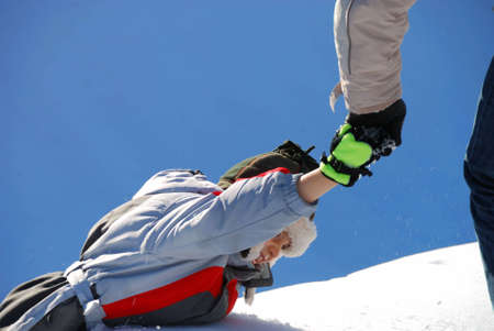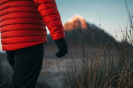 Hand black glove against the background of white snow in winter, a man stretched his hand forward to meet the sun, an outstretched palm, a tourist on a hike in the mountains. high quality photo