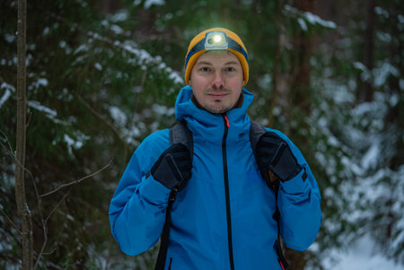 Hiker wearing headlamp exploring snowy forest at night