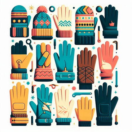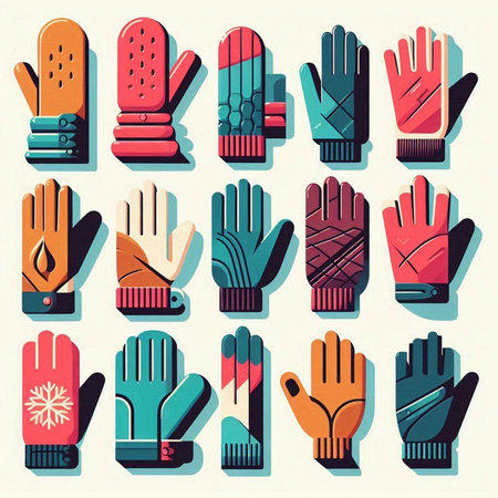 Winter gloves and accessories icons set in flat style. Vector illustration.