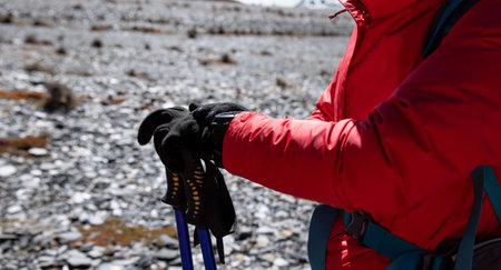 Woman hiker checking the altitude on sportswatch in winter tibet