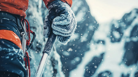close-up of ice ax in hand of a man against background of blurred winter landscape
