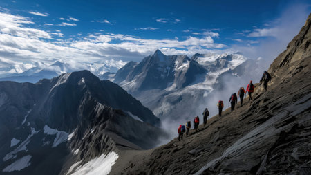 Adventurers trek up steep mountain path toward peak, created with AI