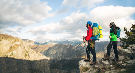 Young mountaineers standing with backpack on top of a mountain and enjoying the view