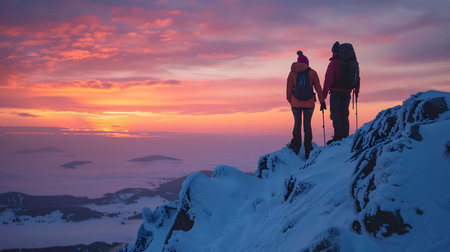 Hikers enjoying breathtaking sunrise view from snowy mountain top.