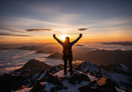 Silhouette of a man standing on top of a mountain and enjoying the view of the sunrise