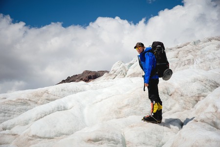 Traveler in a cap and sunglasses with a backpack on his shoulders in the snowy mountains on the glacier against the sky and clouds. Traveler in a natural environment