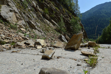 Svaneti, Georgia - 05 May, 2021: The tractor clears the road from a landslide. Mountains