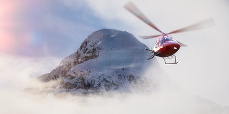 Helicopter flying over the Rocky Mountains during a colorful sunset. Landscape from BC, Canada near Squamish and Whistler. Epic Adventure Composite. 3D Rendering Heli. 3D Illustration
