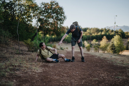 Two hikers on a dirt trail help a friend during an outdoor hike
