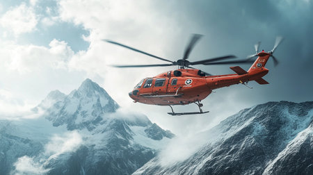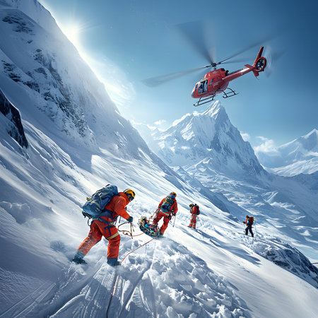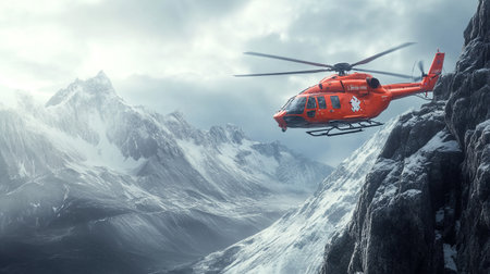 A red helicopter flies over a snowy mountain range, where climbers are being rescued. The scene is full of action and adventure.