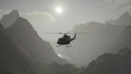 A helicopter navigates above rugged mountains, showcasing a stunning natural landscape at dawn. The sky is illuminated with early morning light, enhancing the surroundings.