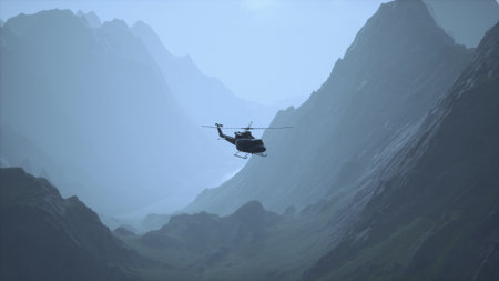 A helicopter glides gracefully through a tranquil mountain range, surrounded by towering peaks and soft shadows. The sky is painted in soothing hues of twilight, creating a peaceful atmosphere.