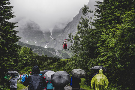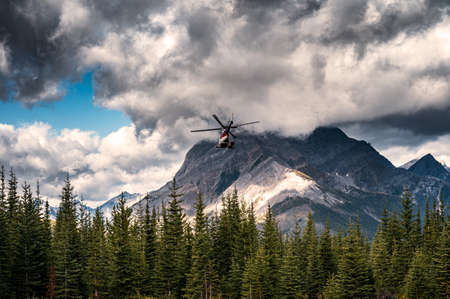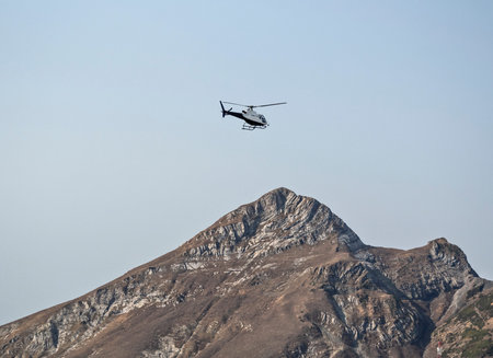 Flying helicopter in the High Mountains looking for hikers and tourist. Rescue team helping tourist that had an accident.