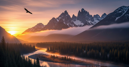 A stunning mountain landscape at sunrise reveals gliding birds against a misty forest backdrop. The warm golden light creates a serene atmosphere in nature.