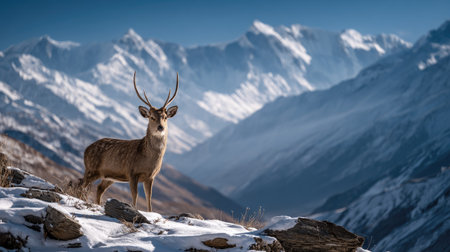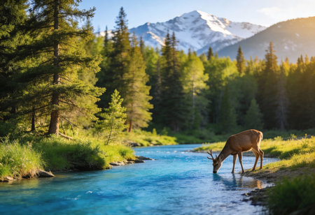 Wildlife Symphony, Deer, Snowy Peaks, and Antler Reflection in Lakeside Harmony. Generative AI