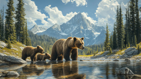 A mother bear nurses her newborn cubs in a serene mountain valley, with crystal-clear streams and towering pines.