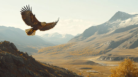 Golden eagle soaring over a vast alpine valley, wings spread wide against a clear, crisp autumn sky